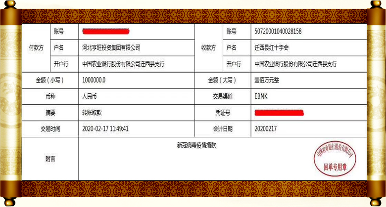 2月17日河北亨旺投資集團(tuán)再次捐款100萬元